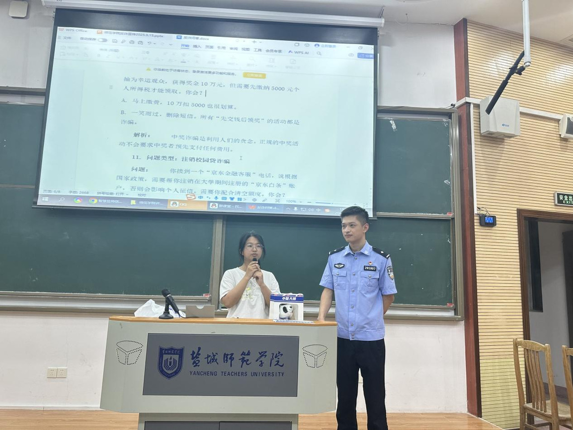 为切实增强学生反诈防骗意识能力,有效遏制电信网络诈骗,9月24日晚,我院“一站式”学生社区成功举办“开学反诈第一课”专题讲座。本次活动邀请盐城经济技术开发区公安局于利之警官主讲,2025级200余名新生参与。